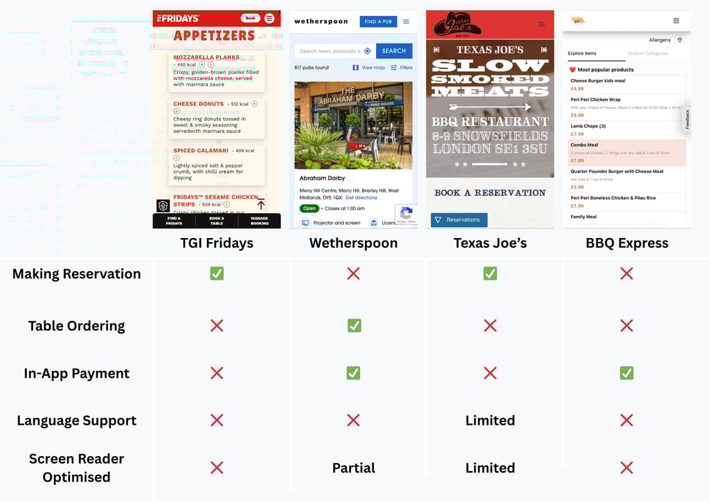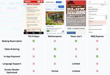 In order to understand the curent market and to identify systemic gaps that are preventing users from ordering independently (particularly those with accessibility needs or language barriers), I've conducted a competitive audit on four different restaurants