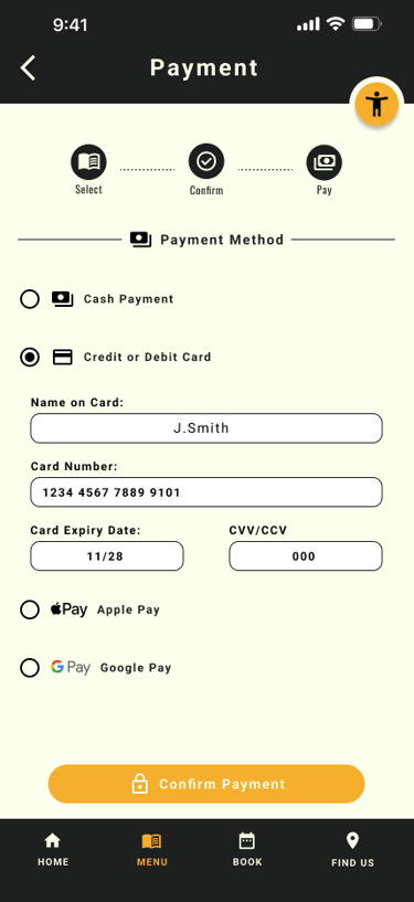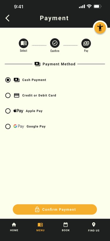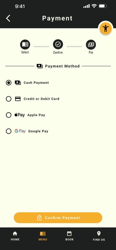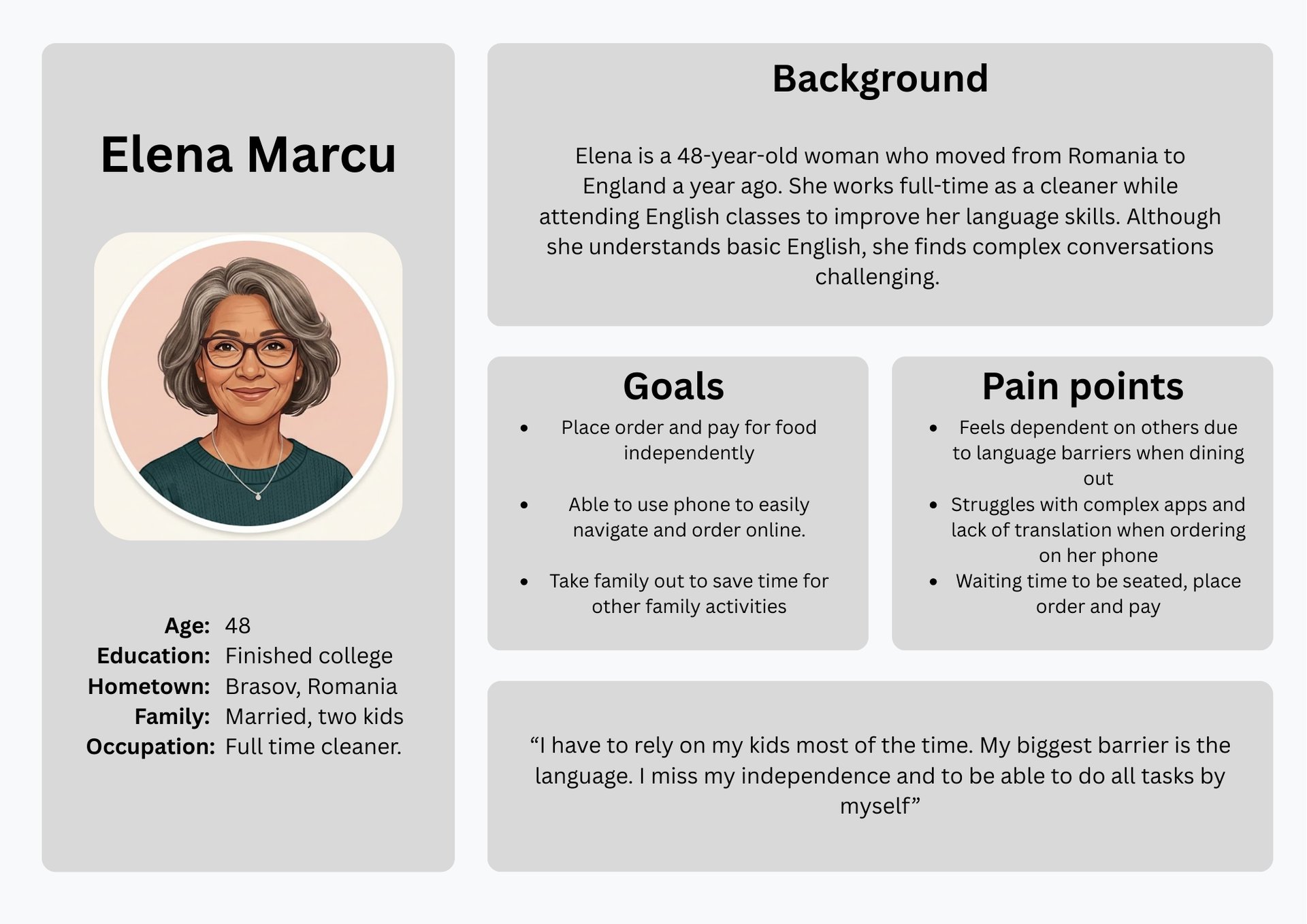 Many restaurants lack digital ordering and payment options, creating frustration and dependency for vulnerable users, including non-native English speakers and visually impaired users.