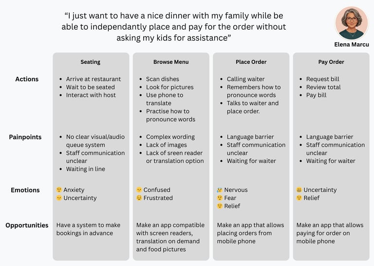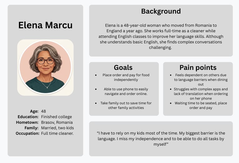 During early discovery, I identified a critical gap: many users struggle to order independently due to accessibility limitations, language barriers, and complex ordering systems. These issues create frustration, increase dependency on staff, and slow down the dining experience.